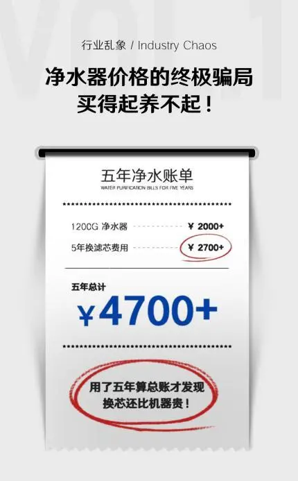 如今,追求健康生活的热潮中,净水器走入许多家庭,保障饮水安全。但净水行业乱象频出,消费者本意为健康购置净水器,却掉进 “买得起养不起” 的坑。像常见的 1200G 净水器,购机 2000 多元看似不贵,可算上五年使用成本,光滤芯更换费就 2700 多元,五年总花费超 4700 元,换芯成本比机器还高。这让消费者失望,净水器从而成为了“智商税家电”的代名词。