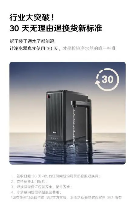 当行业普遍固守“7天未拆封退货”规则时,352以大于4倍于行业标准的30天全场景试用政策颠覆传统:用户可深度安装通水、多次移机测试,期间产生的滤芯损耗、拆机移机费用均由品牌全额承担。这一政策将试用期从“快递签收倒计时”转变为“真实生活实验室”,用30天的零成本自由验证,彻底击穿“买前心动、买后心痛”的消费痛点。