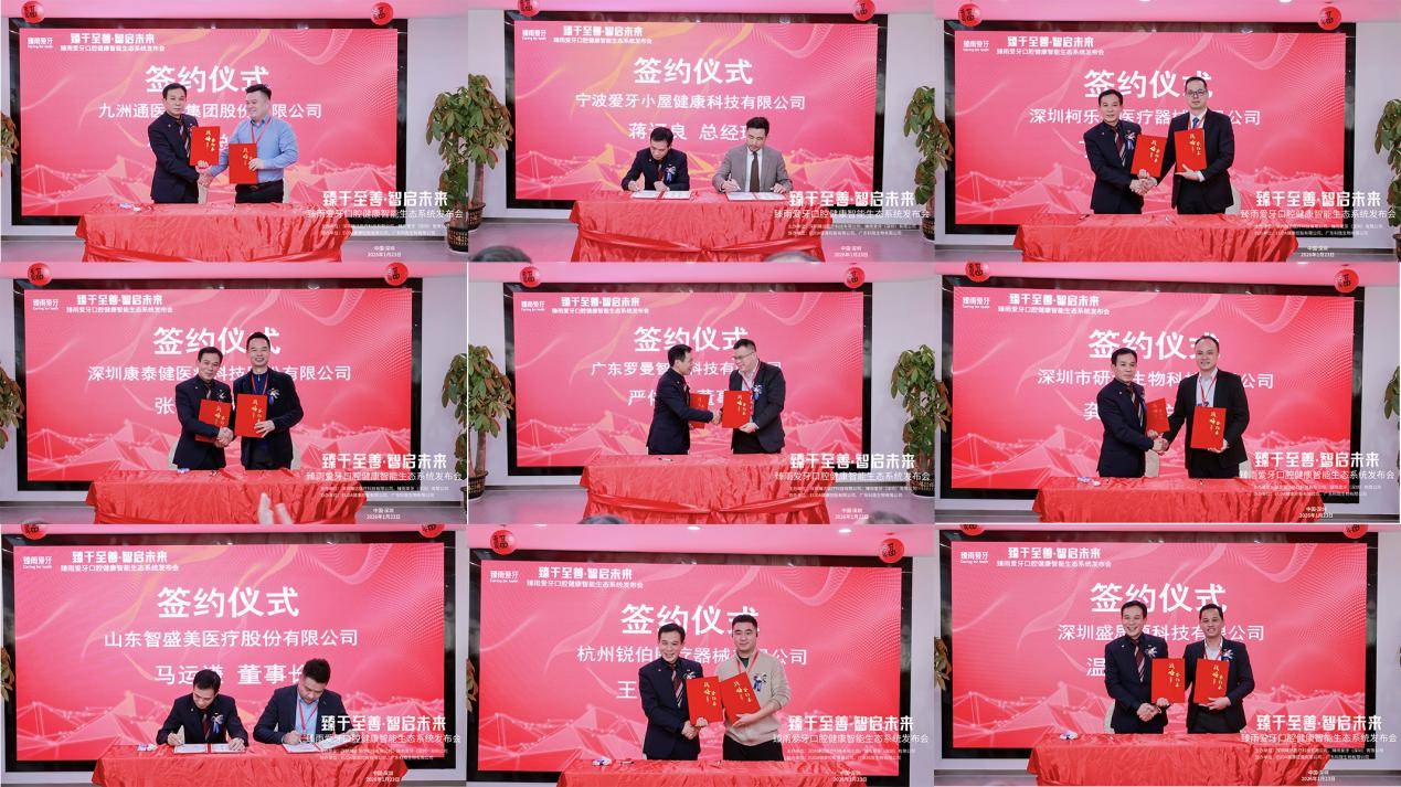 重磅签约环节中,臻雨爱牙与 26 家涵盖技术、产品、渠道、服务的优质单位正式达成战略合作,包括广东罗曼智能科技有限公司、山东智胜美医疗股份有限公司、九洲通医药集团股份有限公司、深圳研元生物科技有限公司等,合作覆盖产品入驻、技术联合研发、渠道拓展等多个维度。同时,来自中华口腔医学会的专家与企业代表共同发起《口腔预防服务行业规范倡议》,明确数字化预防工具的技术标准、服务流程及数据安全要求,助力行业从分散发展迈向规范化协同。