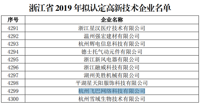 2019年12月4日,根据《高新技术企业认定管理办法》(国科发火〔2016〕32号)和《高新技术企业认定管理工作指引》(国科发火〔2016〕195号)有关规定,浙江省将2019年6229家企业拟认定高新技术企业名单(详见附件)予以了公示。杭州飞巴网络科技有限公司被评为“国家高新技术企业”